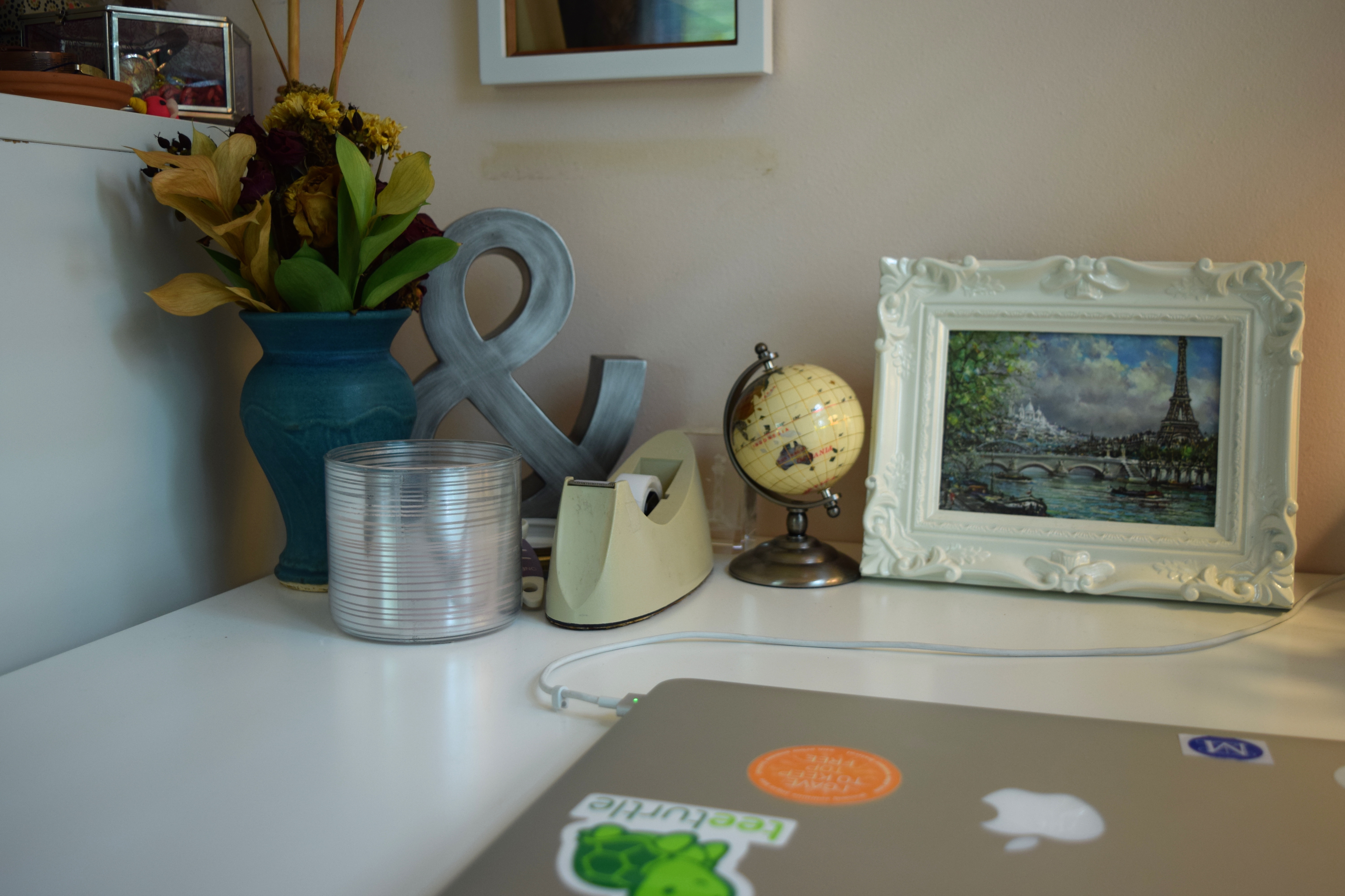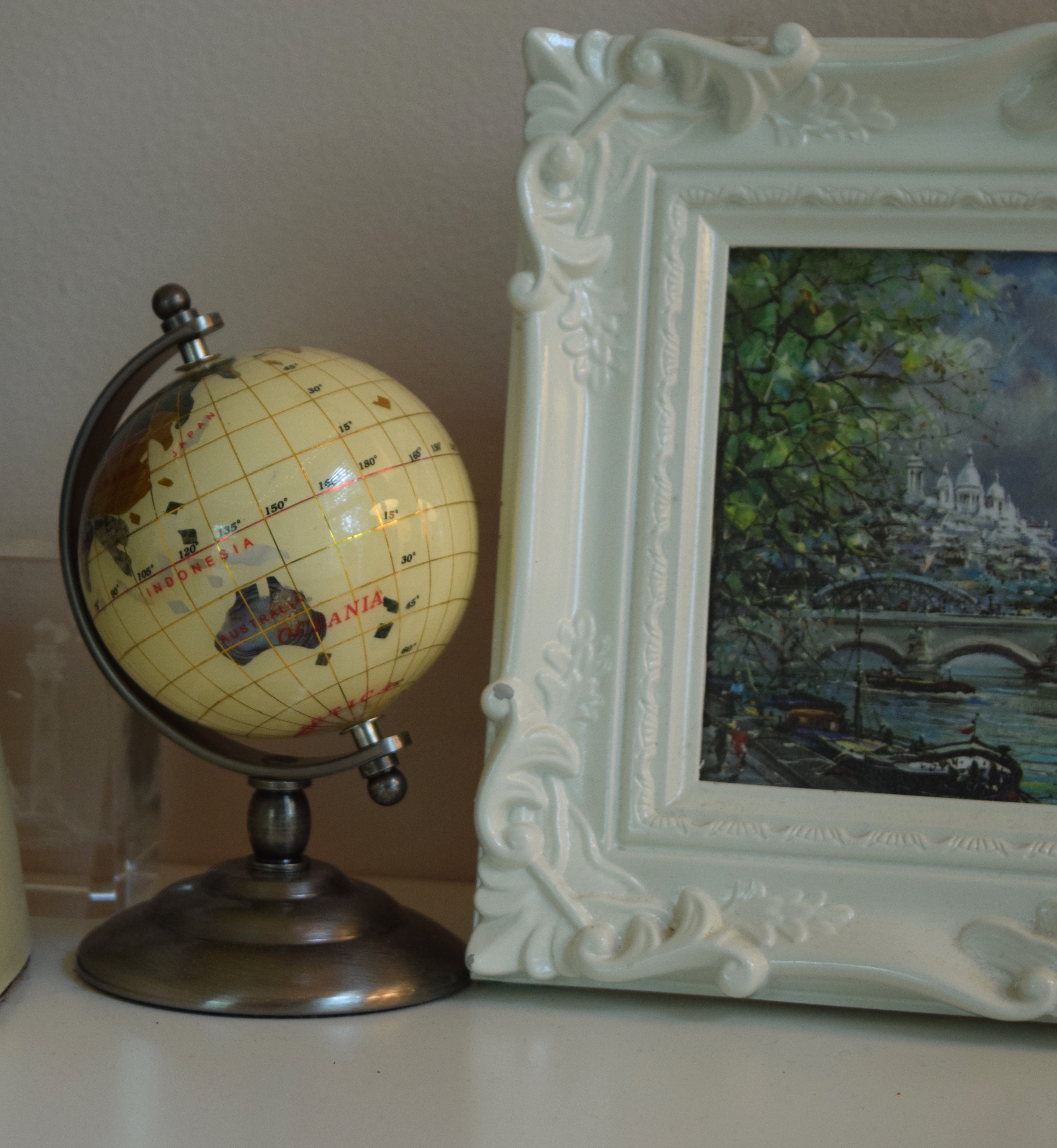 My favorite candle ever.I found this cute little globe at a resale shop, and it’s natural to have it next to a painting of Paris